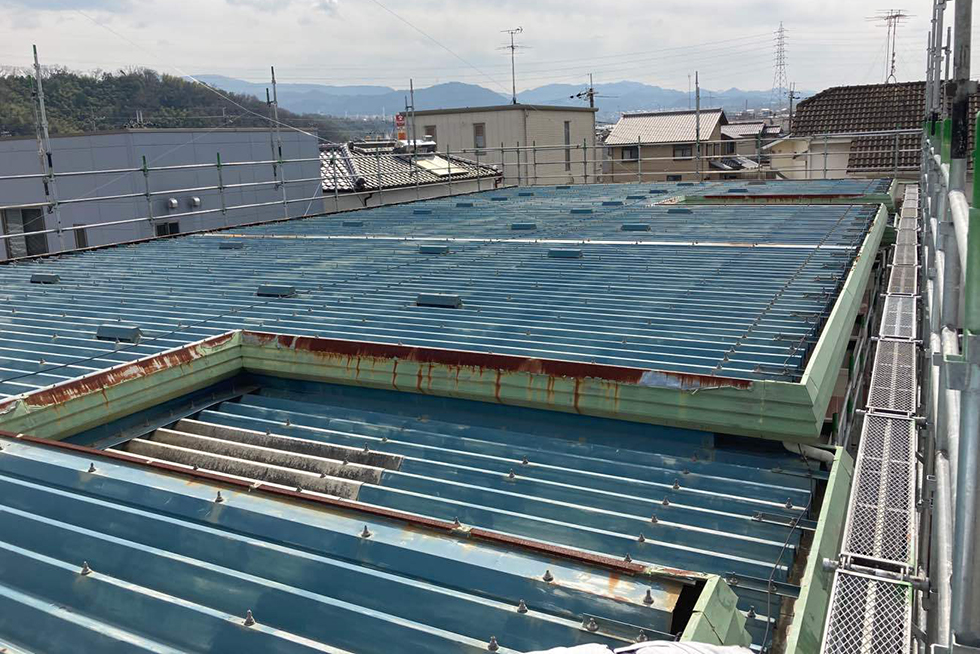 錆びが目立っていた折半屋根は、しっかり錆止めを施したうえで塗装。また、全てのボルトにキャップを取り付けることで、水の浸入による劣化を防止。